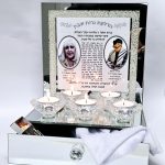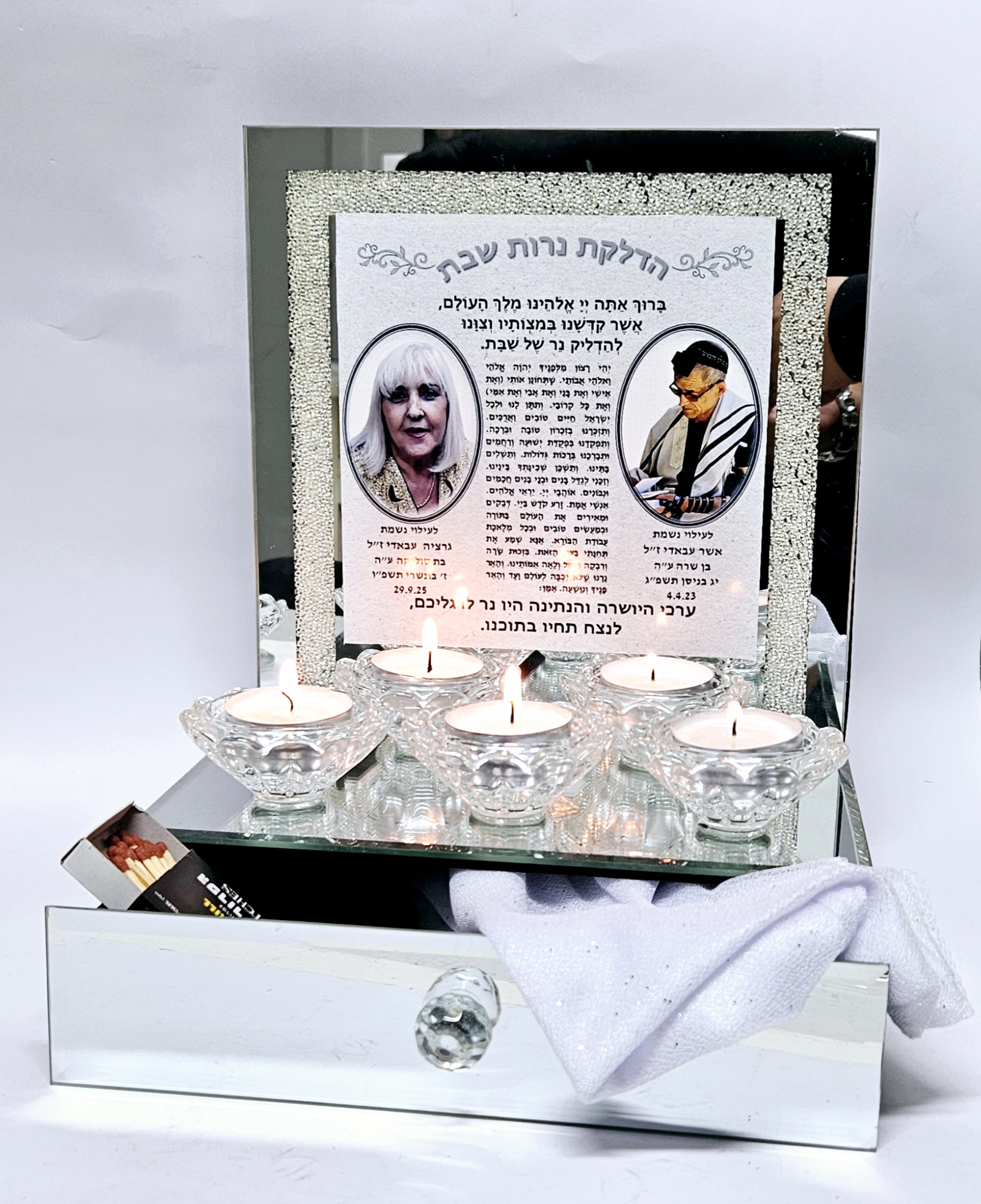 פמוטים לשבת מעמד יוקרתי עם חריטה אישית לזיכרון ולהנצחה מעמד ל 5 פמוטים עם מגירה זכוכית מראה ומסגרת שברי קריסטל